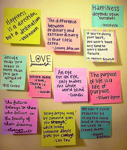 Une autre idée que j’ai eue: réaliser un cadre avec des mots ou citations positives. J’utiliserai pour cela quelques post-it de différentes couleurs sur lesquels j’inscrirai les meilleures citations que j’ai pu trouver (dont pas mal que j’ai déjà partagées ici même sur OTB).